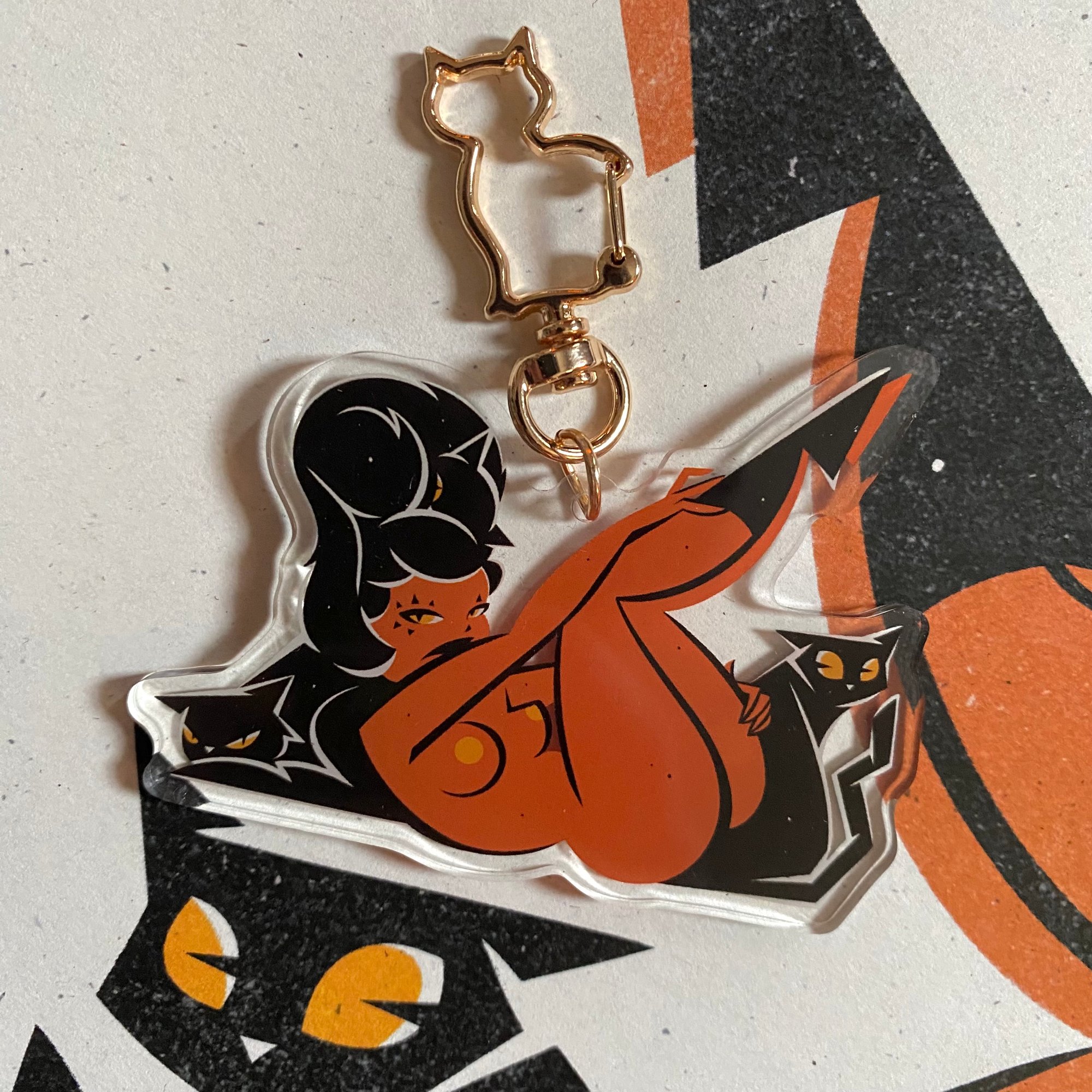 acrylic key chain featuring artwork on both sides + a kitty key ring clasp